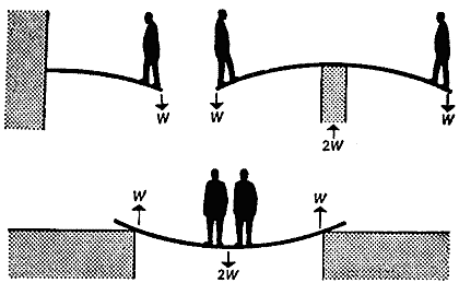 Консоли широко распространены в технике, но еще чаще используются обычные балки, вроде тех, которые принято называть "свободно опертыми" (рис. 14). Примером такой балки может служить доска, переброшенная через канаву или ручей. Как же такая балка соотносится с консольной? Наглядный ответ на этот вопрос дает рис. 14. Дело в том, что свободно опертую балку можно рассматривать как две консоли, жестко связанные друг с другом в местах заделки и перевернутые на 180°. В то время как наибольшее напряжение в консоли возникает в месте ее заделки, в нашей новой балке оно будет в центре. Поэтому такие балки обычно ломаются пополам.
