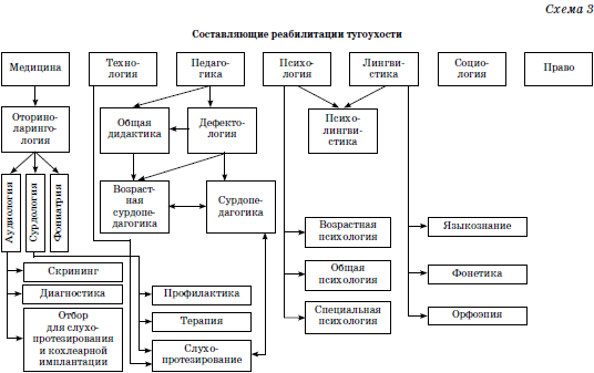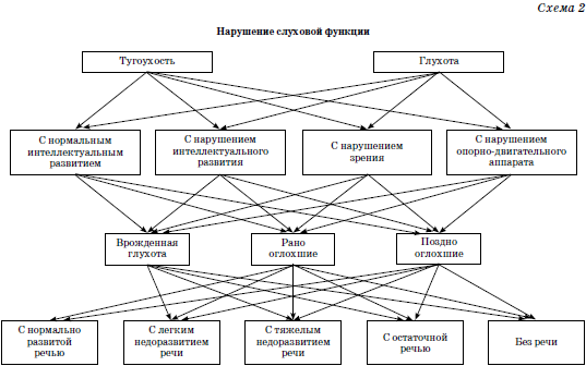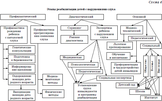 Методы экспертизы зависят от возраста ребенка и от уровня его психоречевого развития. Обследование ребенка в специализированном медицинском учреждении (сурдологическом кабинете, отделении, центре) включает педиатрическое, оти-атрическое, сурдологическое и психолого-педагогическое обследование. В результате медико-психолого-педагогической экспертизы должен быть установлен диагноз, обсуждены способы и средства необходимой помощи, а также получены ответы на целый ряд вопросов: о состоянии наружного и среднего уха; уровне снижения слуха; степени и характере тугоухости (в соответствии с принятой классификацией); локализации поражения слухового анализатора; наличии отклонений в соматическом и психическом статусе ребенка с нарушенным слухом, их степени выраженности; уровне общего и речевого развития ребенка; возможных и необходимых лечебно-профилактических мероприятиях; решении вопроса о слухопротезировании или кохлеарной имплантации; определении индивидуальной программы педагогической и психологической коррекции (схемы 2–4).