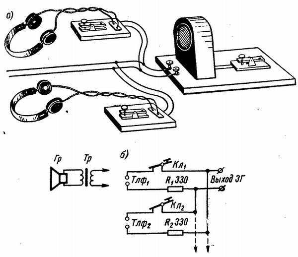 При коллективном обучении подключается электродинамический громкоговоритель Гр, предназначенный для радиотрансляции. В этом случае звуковой генератор можно смонтировать в корпусе громкоговорителя, подключив еще один каскад усиления. При коллективных занятиях для каждого обучающего радиотелеграфиста на корпус громкоговорителя или отдельной панели можно установить еще несколько пар гнезд для включения параллельных цепей. В каждую из параллельных цепей последовательно включается дополнительный резистор. Такие резисторы необходимы для предохранения всей сети от короткого замыкания (рис. 4, б). Величины этих резисторов подбираются практически в зависимости от числа параллельных цепей.