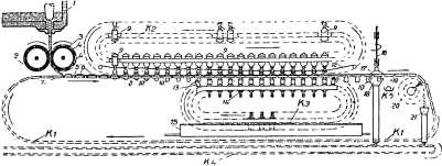 Машина советского изобретателя Витрина для изготовления ламповых колб (конвейерный тип). 1 — ванна с расплавленным стеклом; 2 — вал; 3 — вал с углублениями; 4 — углубления; 5 — стекло; 6 — порции стекла для колб; 7 — платформочки конвейера K1; К2 — второй конвейер с дутьевыми механизмами; 13 и 14 — формовочные механизмы конвейера К3; 10 — выдуваемые колбы; 17 — вращающийся диск, срезающий готовые колбы.