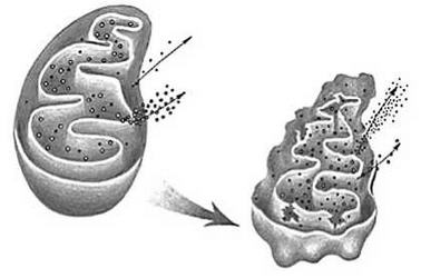 Митохондрия старой клетки, подвергшаяся атаке свободных радикалов