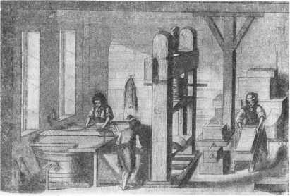 Ручной способ изготовления бумаги, применявшийся до начала XIX столетия. Слева ванна с бумажной массой. Посредине пресс. Справа рабочий собрал стопку готовых листов бумаги.