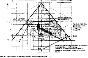 Сейчас можно показать, что южный и восточный края пирамиды Хафры четко вписываются в сетку Смещение диагонали возникает только потому, что она была пост роена с несколько меньшим планом основания, чем Великая пирамида. Пирамида Хафры имеет основанием квадрат со стороной в 412,5 локтя, то есть почти ровно 15/16 размера Великой пирамиды. Больше того, две линии сетки, определяющие положение пирамиды Хафры, находятся в пропорции золотого сечения с большим квадратом сетки, который заключает в себе все три пирамиды.