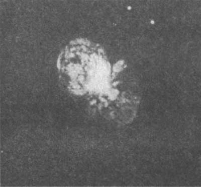 Однако всех превзошла невзрачная звездочка из созвездия Киль, обозначенная греческой буквой ? (эта). Сейчас трудно представить, что в 1843 г. звезда была ярче в полторы тысячи раз, сияя на небе почти как Сириус. Вспышка длилась беспрецедентно долго — по крайней мере с 1677 по 1885 г. За эти 208 лет светило то трижды разгоралось, делаясь на десятилетия одной из ярчайших звезд неба, то слабело в десятки раз. Сброшенная звездой газовая оболочка теперь видна как крохотная туманность в форме гантели (рис. 1). Некоторые специалисты полагают, что то была уже неудачная вспышка сверхновой звезды, только вместо года-двух взрыв растянулся на пару веков. Не исключено, что в ближайшие годы мы вновь сможем насладиться экзотическим зрелищем — с 1995 г. звезда стала вдвое ярче.