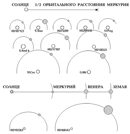 Схема орбит некоторых экзопланет в сравнении с характерными расстояниями в Солнечной системе. В верхней части рисунка масштаб указан половиной большой полуоси орбиты Меркурия, в нижней – орбитами Меркурия, Венеры и Земли, Примерно выдержаны относительные размеры, звезды и орбиты.