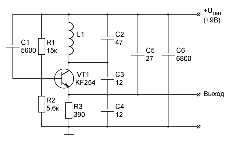 Как и в других схемотехнических решениях подобных высокочастотных LC-генераторов, в данной схеме коллектор транзистора VT1 подключен непосредственно к нижнему по схеме выводу катушки L1. В этом случае глубина положительной обратной связи определяется лишь соотношением величин емкостей конденсаторов С3 и С4. Однако часто коллектор транзистора подключается к отводу от соответствующего витка катушки L1. В этом случае глубина связи цепи ПОС с выхода активного элемента на его вход зависит и от выбора витка катушки, к которому подключается коллектор транзистора VT1.