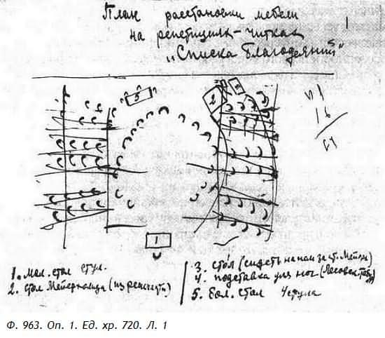 Этот поворот сцены по отношению к линии рампы, т. е. к зрителю, Мейерхольд фиксирует уже во время читок пьесы. Сохранился листок с чертежом, поясняющим, как именно располагаются актеры и режиссер во время застольных репетиций[243]. 24 марта П. Цетнерович, помогавший Мейерхольду на репетициях, записывает: «Профильное построение, а не фронтальное»[244].