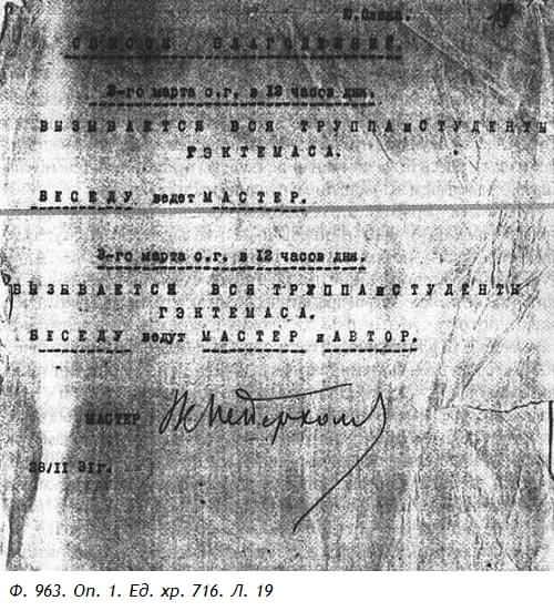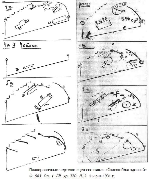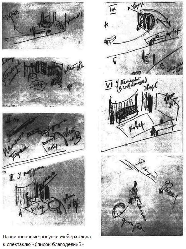 Наконец, последний документ: доклад 3 мая 1931 года о макете к «Списку». В нем Мейерхольд предельно краток, деловит, но и в этом выступлении «сугубого практика» неизбежны и апелляция к новым партийным установкам (а именно: больше внимания философскому фронту), и ссылка на последнее постановление ЦК ВКП (б) (по поводу художественной литературы).