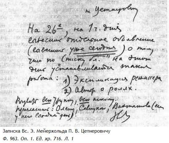 Мейерхольд. Я хочу вас нагрузить, чтобы вы работали над той и над другой ролью одновременно. Условимся, что у вас имеется позиция к отступлению.