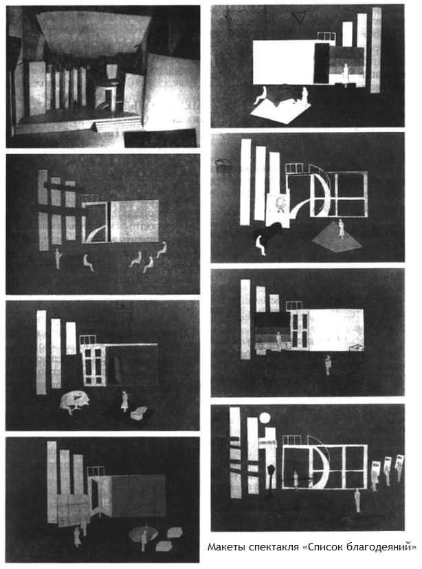 Макет к спектаклю «Список благодеяний» не должен восприниматься как оформление данного спектакля. Это есть только предпосылка, чтобы показать, что нам не нужно сцены, нам нужен только свет и актер. Но, поскольку мы имеем несчастье работать в этом театре, поскольку нужно все сделать к тому, чтобы публика на минуточку забыла, что это сценическая коробка, приходится делать конструкции. Должен отметить ненормальное положение, что разрушили часть конструкции «Бани». Это прекрасная конструкция, которая, например, могла пригодиться для устройства торжественных заседаний, можно было бы ее установить для юбилейного торжества, она дает возможность расположить действующих лиц по балконам, чтобы публика могла видеть каждого. Движущийся тротуар — прекрасный элемент для многих постановок.