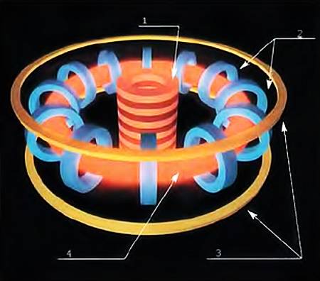 1. индуктор; 2. тороидальные катушки; 3. полоидальные витки; 4. плазменный шнур.