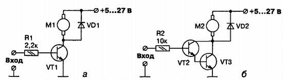В качестве VT1 и VT2 рассмотренных схем можно использовать любые маломощные транзисторы структуры n-p-n, например КТ315, КТ3102. Демпфирующие диоды должны выдерживать ток, не менее тока срабатывания используемого реле. В большинстве случаев можно обойтись диодами типа КД521, КД522. Электронные реле отличаются от рассмотренных тем, что вместо электромеханических реле в коллекторную цепь непосредственно включается коммутируемая нагрузка, например электродвигатели. К транзисторам электронного ключа при этом предъявляются повышенные требования. Их максимально допустимый коллекторный ток должен быть не менее тока, потребляемого нагрузкой.