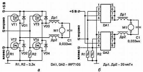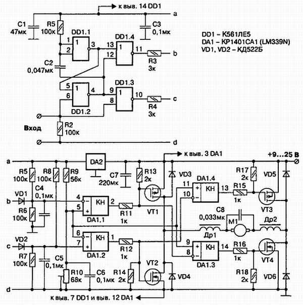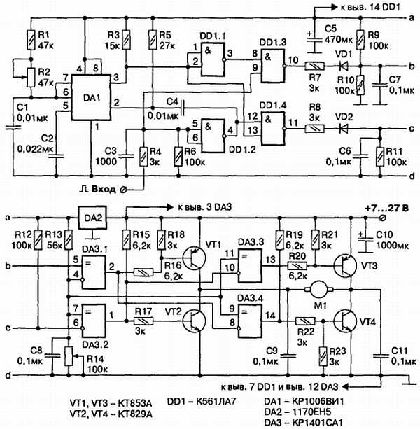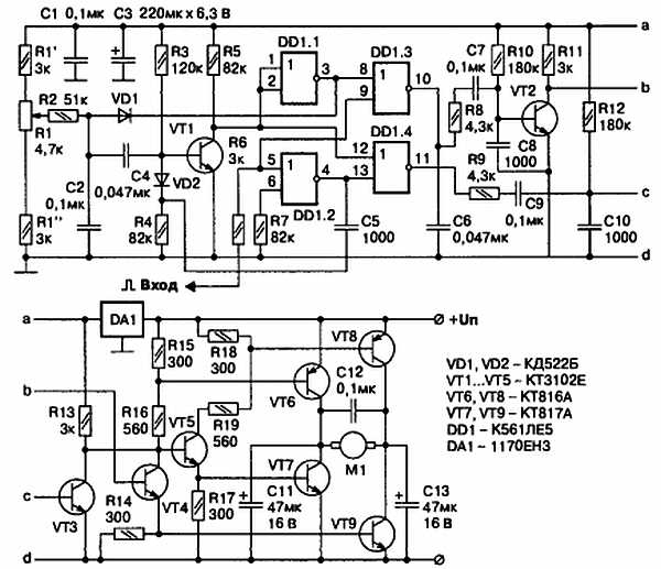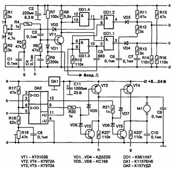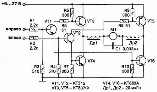 Подача положительного напряжения, например на вход «вправо», закрывает транзистор VT3 и отпирает VT4. Через двигатель протекает ток снизу вверх. При подаче положительного напряжения на вход «влево» открытыми окажутся транзисторы VT2, VT3, и двигатель будет вращаться в обратную сторону. Диоды VD1—VD4 обеспечивают протекание тока самоиндукции, который возникает в обмотках двигателя при отключении входных сигналов.