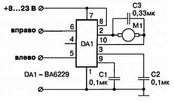 Очень удобно для реверсивного управления двигателями использовать специализированные микросхемы драйверов. В этом случае полностью отсутствуют навесные детали, за исключением элементов искрогашения двигателя. Номенклатура таких микросхем весьма широка. Основные типы и характеристики можно посмотреть, например в [17]. На рис. 7.5 приведена схема исполнительного устройства на микросхеме ВА6229.