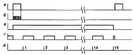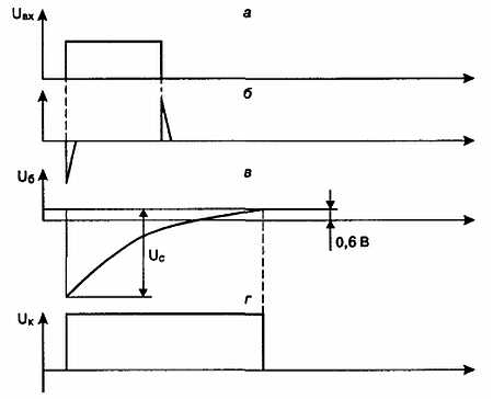Отрицательный импульс с выхода дифференцирующей цепи (рис. 7.7, б), соответствующий переднему фронту канального импульса, запирает транзистор. Потенциал коллектора скачком возрастает до уровня питающего напряжения (рис. 7.7, г), инвертор DD1.1 опрокидывается, на его выходе устанавливается нулевой потенциал, и левая обкладка конденсатора С4 через диод VD1 оказывается подключенной к корпусу. Отрицательное напряжение с правой обкладки прикладывается к базе транзистора, удерживая его в запертом состоянии (рис. 7.7, в).
