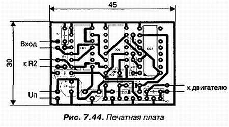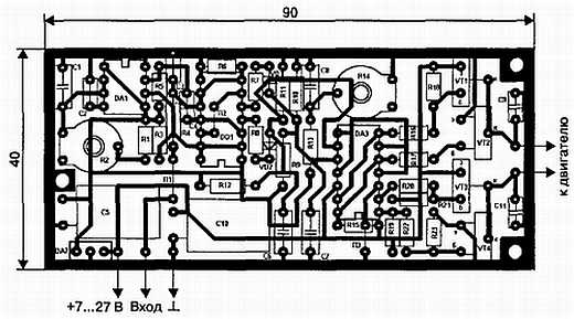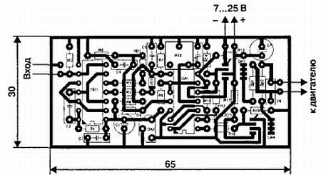 Печатная плата устройства приведена на рис. 7.32. На ней предусмотрены места для конденсаторов С0 и С26, отсутствующих на принципиальной схеме. Необходимость в них может возникнуть при использовании двигателей с сильно искрящим коллектором. Оба конденсатора по 0,1 мкФ. Выходные транзисторы устанавливаются вертикально и радиаторов для охлаждения не требуют.