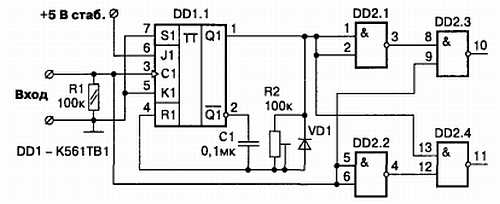 Роль временного дискриминатора играет элемент DD2.1. После буферного каскада DD2.2 на выводе 10 выделяются разностные положительные импульсы при любом соотношении длительностей опорного и канального импульсов, кроме ситуации, при которой эти длительности равны.