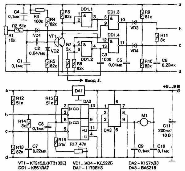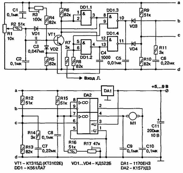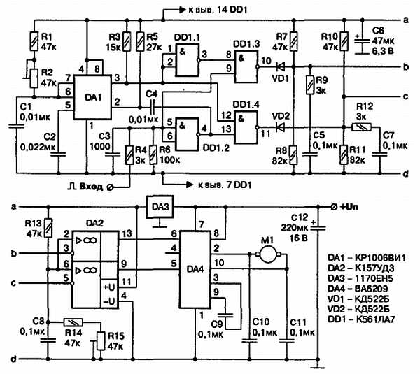 Ждущий мультивибратор и схема формирования разностных импульсов выполнены на элементах DD1.1—DD1.4. Далее следуют удлинители импульсов на элементах VD1, VD2, R4—R9, С3 и С4. Входы специализированной микросхемы управления двигателями DA1 имеют гистерезис, что очень удобно для реализации удлинителя.