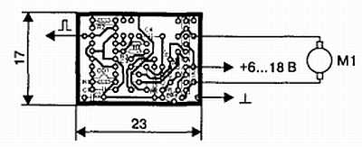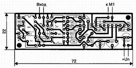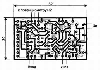 Промышленность выпускает мощные сдвоенные операционные усилители КР1040УД2 (импортный аналог L2724) с допустимым током нагрузки до 1 А, что позволяет объединить функции удлинителя импульсов и выходного мостового каскада. Действительно, ведь выходы операционных усилителей выполняются по двухтактным схемам, образуя, фактически, половину моста. Схема принимает вид, изображенный на рис. 7.36. На рис. 7.37 приведена печатная плата.