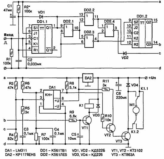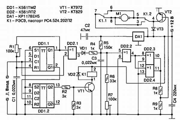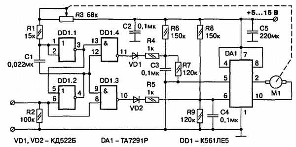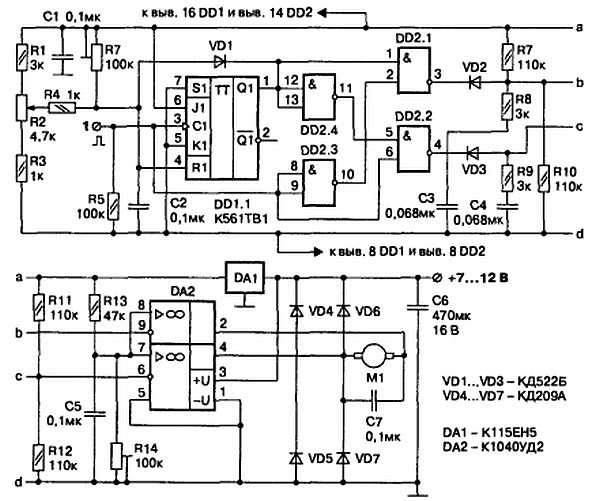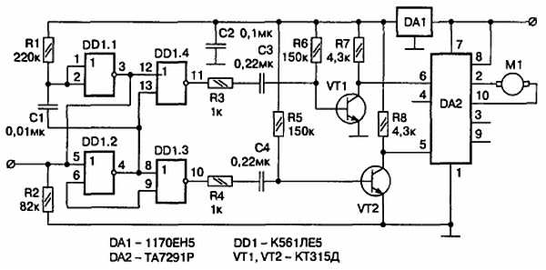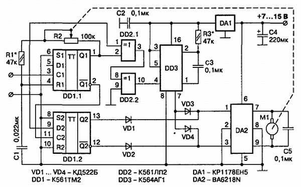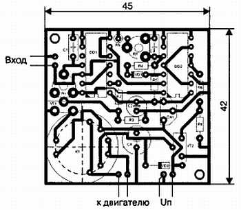 Стабилизатор напряжения DA1 обеспечивает стабильность временных процессов в одновибраторе и удлинителе импульсов. Конденсаторы С9, С10 снижают уровень помех от коллекторного узла двигателя и предотвращают перегрузки выходных транзисторов от ЭДС самоиндукции, возникающей в обмотке двигателя вследствие питания его импульсным напряжением.