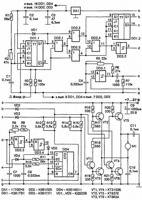 Схема рассчитана на применение двигателей с током потребления до 8 А. Для менее мощных двигателей, потребляющих ток не более 1–2 А, в мостовом каскаде можно применить транзисторы КТ816 на месте VT3, VT5 и КТ817 на месте VT4, VT6.