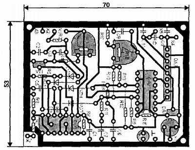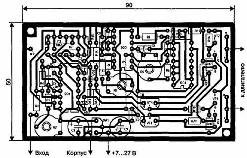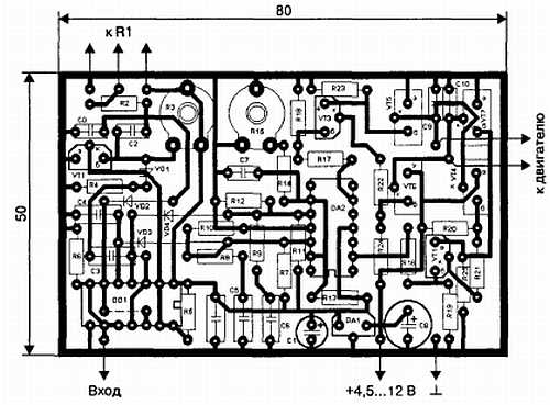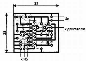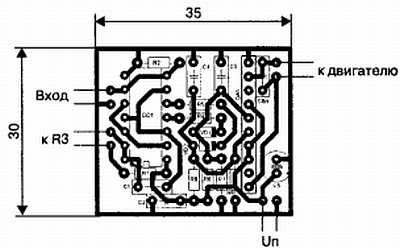 Печатная плата регулятора хода изображена на рис. 7.10. Она выполнена из одностороннего стеклотекстолита толщиной 1,5 мм. Электролитические конденсаторы С5 и С10 рассчитаны на рабочее напряжение 6,3 и 25 В соответственно, устанавливаются на плату горизонтально.