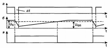 Далее разностные импульсы необходимо подвергнуть удлинению. Рассмотрим эту процедуру для ситуации, когда τк > τ0. Удлинитель для этого случая реализован на интегрирующей цепи R7R8C6 и верхней части операционного усилителя DA2, работающего в режиме компаратора напряжений. В исходном состоянии конденсатор С6 заряжен до некоторого напряжения Uc (рис. 731, б), которое прикладывается к инверсному входу ОУ.
