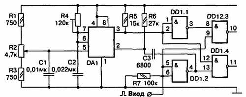 Этим импульсом запускается ждущий мультивибратор, собранный на базе таймера DA1. Длительность получаемых на выводе 3 положительных импульсов определяется постоянной времени цепи R1R2C1 и устанавливается равной 1,5 мс. Временной дискриминатор аналогичен рассмотренному выше с одним отличием: разностные импульсы на его выходах имеют отрицательную полярность.