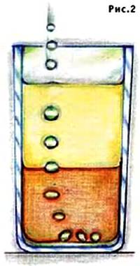 Налейте в пробирку подсолнечное масло, а сверху — машинное. Должно получиться два слоя с четкой границей. Машинное масло недостаточно прозрачно, имеет красноватый цвет. Покрасьте воду тушью и понаблюдайте, как одна и та же капелька жидкости, проходя через различное масло, меняет свою форму. Плотность машинного масла меньше, чем подсолнечного, поэтому и выталкивающая сила меньше. Капельки в нем опускаются быстрее, с ускорением. Сила тяжести делает их форму чуть сплющенной по вертикали. Но, входя в нижний слой прозрачного масла, капелька вновь становится похожей на шар.