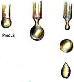 Понаблюдайте за образованием капли на кончике пипетки. Вначале образуется полусферическая оболочка. Она растет, как бы раздувается, стремясь принять некую удлиненную шарообразную форму. Вот появляется тонкая шейка, и капля отрывается (рис. 3).