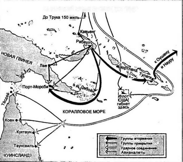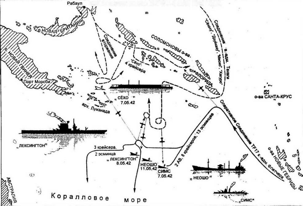 Этот сложный план демонстрировал главный дефект японской стратегии - полное пренебрежение к противнику, все возможные решения за которого принимались в Токио, а также распыление своих сил для решения множества частных задач. На этот раз американская разведка сработала превосходно и 17 апреля главнокомандующий флотом США на Тихом океане адмирал Нимитц уже знал, что группа транспортов под защитой легкого авианосца “Сёхо” и ударного соединения из двух тяжелых авианосцев войдет в Коралловое море.