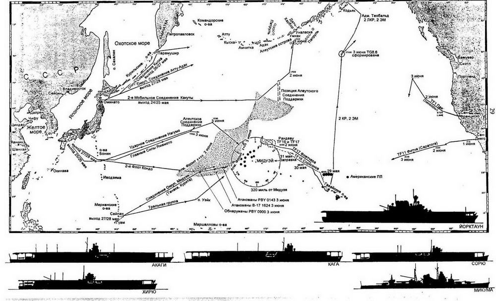 Об авианосной битве у атолла Мидуэй, которая справедливо считается поворотным событием войны на Тихом океане, даже на русском языке, опубликовано так много, что добавить практически нечего. Коснемся только общего хода развития событий, участия в них японских тяжелых крейсеров и суммарных результатов.