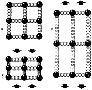 Когда твердое тело полностью свободно от механических нагрузок (что бывает, строго говоря, очень редко), химические связи, или пружины в нашей модели, находятся в нейтральном положении (рис. 1, а). Любая попытка сблизить атомы (это мы называем сжатием) или оттянуть их друг от друга (что обычно называется растяжением) сопровождается небольшим укорочением (рис. 1, б) или удлинением (рис. 1, в) межатомных пружин во всем объеме материала. При этом ядра атомов считаются жесткими, кроме того, в твердом теле атомы обычно не обмениваются местами, по крайней мере при умеренных, или "безопасных", нагрузках. Таким образом, податливость твердого тела определяется межатомными связями. Жесткость этих связей может изменяться в широких пределах, но для большинства веществ она намного выше, чем у тех металлических пружин, с которыми мы встречаемся в повседневной жизни. Очень часто величины межатомных сил весьма и весьма велики. Этого и следовало ожидать, если вспомнить о силах, которые могут быть получены при разрыве химических связей горючих или взрывчатых веществ.