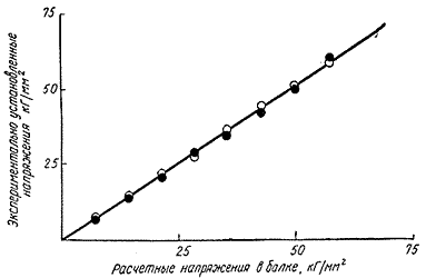 Рис. 2. Сравнение напряжений, установленных экспериментально с помощью дифракции рентгеновских лучей (методом двух экспозиций), с расчетными напряжениями, вычисленными по кривизне изогнутой балки (отожженная малоуглеродистая сталь). Белый кружок - данные экспериментатора A, черный - экспериментаторов B и C.