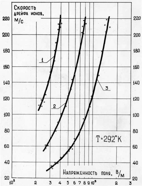 …Если соударения ионов с нейтралами газа носят упругий[73] характер, то для различных изотопов одного и того же газа должна сохраняться и величина сечения соударения. Из кинетического уравнения для ионов следует, что скорость их дрейфа зависит от этого сечения, распределения ионов по скоростям и обратно пропорциональна квадратному корню из их массы. Нет никаких разумных оснований полагать, что функции распределения по скоростям различаются для изотопов. Для больших напряженностей поля, когда скорости дрейфа им пропорциональны, разница значений этих скоростей в гелии-4 и гелии-3, составляла 13–16 %, в то время как отличие корней квадратных из масс этих изотопов составляет 15 %. Вполне можно было сделать вывод, что, при достаточно высоких напряженностях внешнего электрического поля столкновения ионов гелия с нейтралами этого газа носят упругий характер. Однако когда поле становилось слабее, повышалась и вероятность неупругих взаимодействий, свидетельством чему было образование кластеров.