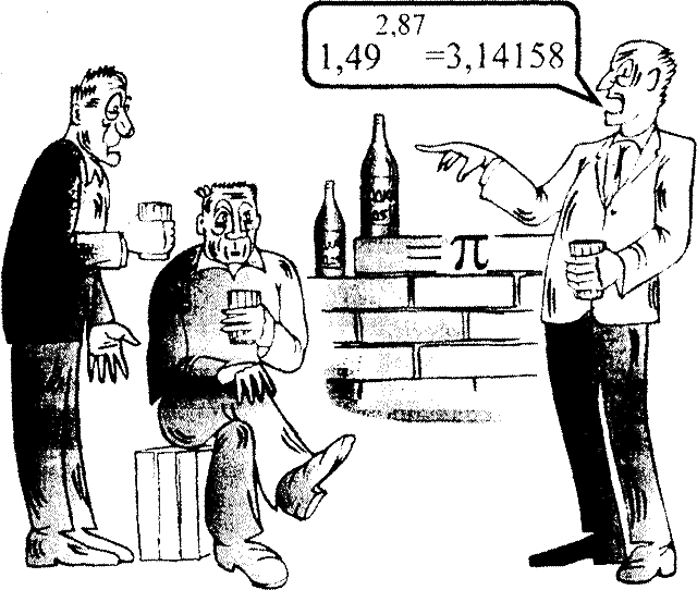 Как пела известная певица, «если долго мучаться, что-нибудь получится». Действительно, после длительных поисков число «пи» было найдено у Пушкина в «Медном всаднике», а затем в соотношении сторон несуществующего сегодня храма Софии Полоцкой. Не желая оставаться в стороне, автор хотел бы внести свой вклад в возникающую буквально на глазах науку — «пи»-ведение. Люди среднего и старшего поколения, конечно, помнят: поллитровка водки в свое время стоила 2 руб. 87 коп. В то же время четвертинка продавалась за 1 руб. 49 коп. Так вот, если 1.49 возвести в степень 2.87, мы можем получить число «пи», причем даже с лучшей точностью, чем при манипуляциях со стихами «Слова…»!