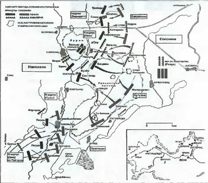 Камердинер императора Констан попробовал уговорить государя немного поесть, но был отослан. Воздух оставался пронизывающе холодным, земля — белой от изморози. Солдаты сжимали в руках ружья. Кони фыркали, позвякивали упряжью и били копытами мерзлую землю. На другой стороне долины австрийцы и русские переругивались, пытаясь выбраться из неразберихи спутанных рядов и занять положенные места. Возле вершины Стары Винограды Александр и Франц, покончив с завтраком, вели разговор с Кутузовым, тревога которого относительно исхода сражения все не уменьшалась.
