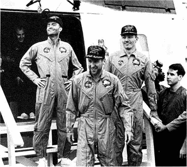 Рис. 6.74. Астронавты «Аполлона-13» выходят из вертолета, севшего на палубу авианосца. Слева направо: Фред Хейс, Джеймс Ловелл, Джон Суиджерт.