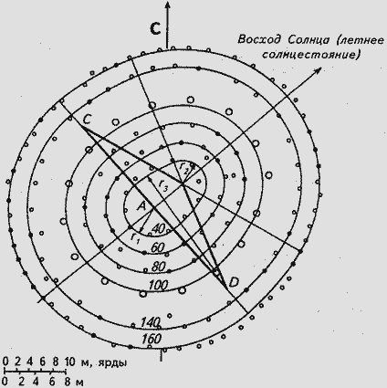 На геометрических памятниках мегалитической культуры Британии использовалась линейная мера, среднее значение длины которой Александр Том определил в 82,9 см. На знаменитом Вудхендже эта мера равна точно 80 см или 1 ар°, или "мегалитический ярд" (рис. 73).