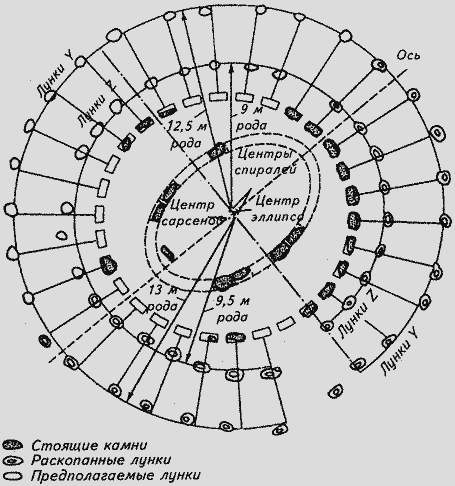 В недавнем прошлом археологи считали, что кроме лунок Обри на этапе Стоунхендж-I были выкопаны еще лунки Y и Z. Сами лунки Обри при этом назывались лунками X. Это мнение изменилось, когда археологи раскопали лунку № 7 кольца Z, обнаружив, что она прорезает землю, заполнявшую лунку сарсенового камня № 7. Предположили, что оба кольца (Y и Z) были выкопаны после установки сарсенового кольца, т.е. на этапе Стоунхендж-III. Уже тогда некоторые исследователи понимали, что производить разметку лунок через установленные камни сарсенового кольца и трилитов почти невозможно. После работ Александра Тома [103, 104] от "почти" ничего не осталось. Он выяснил, что лунки лежат не на окружностях, а на спиралях, каждая из которых образована из полуокружностей.
