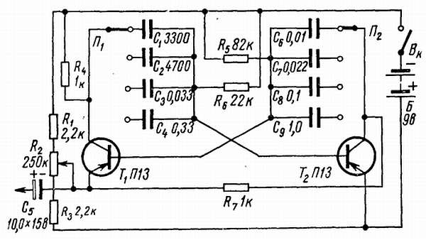 Для более точной настройки аппаратуры или в качестве источника стандартных импульсов можно предложить собрать несложную схему генератора прямоугольных импульсов на фиксированных частотах. Такой генератор (см. рис. 7) представляет собой мультивибратор с последовательным включением транзисторов Т1 и Т2 (оба транзистора типа П13—П15). Такая схема проста и по сравнению со схемой симметричного мультивибратора позволяет получать лучшую форму выходного напряжения, приближающуюся к идеальному прямоугольнику.