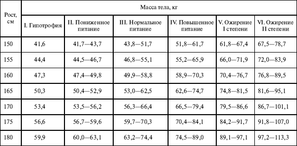 Перед медицинским освидетельствованием, но не ранее чем за 30 дней, у всех граждан, подлежащих первоначальной постановке на воинский учет, проводится флюорографическое исследование органов грудной клетки, анализ мочи, анализ крови, а в день освидетельствования – измерение роста и массы тела. (Соотношение роста и массы тела у лиц в возрасте 18–25 лет приведено в табл. 1.)