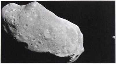 Рис. 8. В 1993 году на пути к Юпитеру зонд «Галилео» сфотографировал астероид 243 Ида, обращающийся вокруг Солнца на расстоянии 440 млн км. Длина астероида всего 50 км; его слабая сила тяготения неспособна придать ему круглую форму. поэтому его называют астероидом, а не карликовой планетой. На этом фото виден и маленький спутник Иды — Дактиль. С разрешения NASA/JPL.