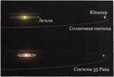 Рис. 15. Планетная система звезды 55 Рака, нарисованная на основе наблюдений, в сравнении с Солнечной системой. Она состоит как минимум из пяти планет, обращающихся вокруг звезды типа Солнца. С разрешения NASA.