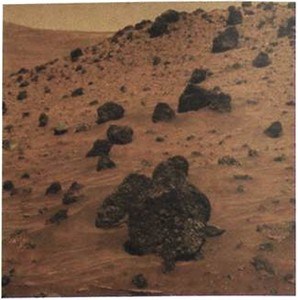 Рис. 7. Это изображение марсианского ландшафта передал марсоход «Спирит». Темный вулканический валун на переднем плане в высоту около 40 см. С разрешения NASA/JPLCaltech/Cornell/NMMNH.