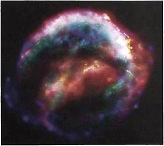 Рис. 22. Сверхновая, взорвавшаяся в 1604 году (ее наблюдал Кеплер), оставила после себя газовую оболочку, расширяющуюся со скоростью 2000 км/с. В этом составном изображении оболочки использованы снимки, полученные в разных диапазонах спектра — от инфракрасного до рентгеновского. Расположенная на расстоянии 13 000 световых лет в созвездии Змееносец, она была последней сверхновой из наблюдавшихся в нашей Галактике. С разрешения NASA, ESA /J PL Caltech/R.Sankrit &W. Blair (John Hopkins University).