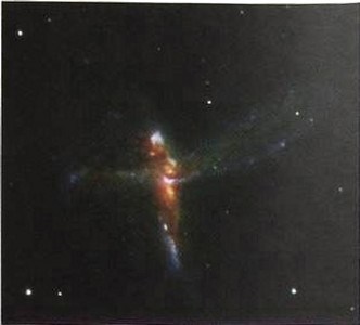 Рис. 21. Эта редкая система, обозначенная как IRAS 19115-2124 и получившая прозвище «Птица» или даже «Фея», состоит из двух больших спиральных галактик и одной неправильной галактики, сливающихся в единую систему. Наблюдения с системой адаптивной оптики на телескопе VLT ESO в ближнем ИК-диапазоне выявили это драматическое космическое столкновение. В этом составном изображении использовано также оптическое фото, полученное космическим телескопом «Хаббл». С разрешения ESO & Henri Boffin and Petri V?is?nen & Seppo Mattila.