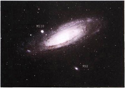 Рис. 17. Соседний с нами большой «остров» во Вселенной — галактика в Андромеде, М31. и ее маленькие спутники — галактики М32 и М110. Эта спиральная галактика, с трудом различимая невооруженным глазом, удалена от нас на 2,5 млн световых лет. С разрешения John Lanoue www.hedfordnights.com.