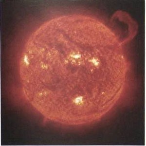 Рис. 5. Ультрафиолетовое изображение Солнца получено в 1999 году космической обсерваторией SOHO. Наше Солнце — обычная звезда возрастом около 5 млрд лет. Несмотря на спорадическую активность, например в форме выброса протуберанцев (виден на фото), длительная стабильная эволюция Солнца позволила жизни существовать на Земле в течение почти всей ее истории. Гигантская масса Солнца более 300 000 масс Земли) заставляет планеты обращаться вокруг него. С разрешения SOHO-EIT Consortium, ESA, NASA.