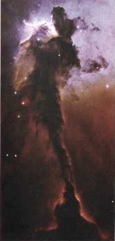 Рис. 13. Область туманности Орел в созвездии Змея, на расстоянии 7000 световых лет. В этом облаке холодного газа и пыли активно рождаются звезды нашей Галактики. Энергия массивных, молодых и горячих звезд работает как скульптор, создающий призрачные формы из межзвездного вещества. Высота этой «башни» около 9.5 светового года, почти в миллион раз больше радиуса орбиты Земли вокруг Солнца. С разрешения NASA, ESA, & The Hubble Heritage Team STScI/AURA.